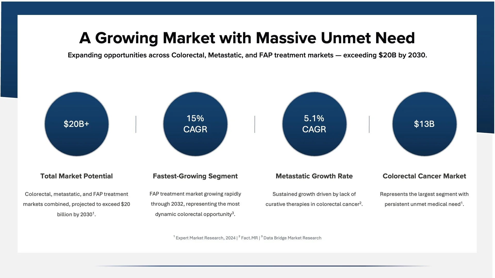 Colorectal cancer remains one of the largest and deadliest cancer markets worldwide, driven by high incidence, long treatment durations, and limited durable options across multiple disease stages.